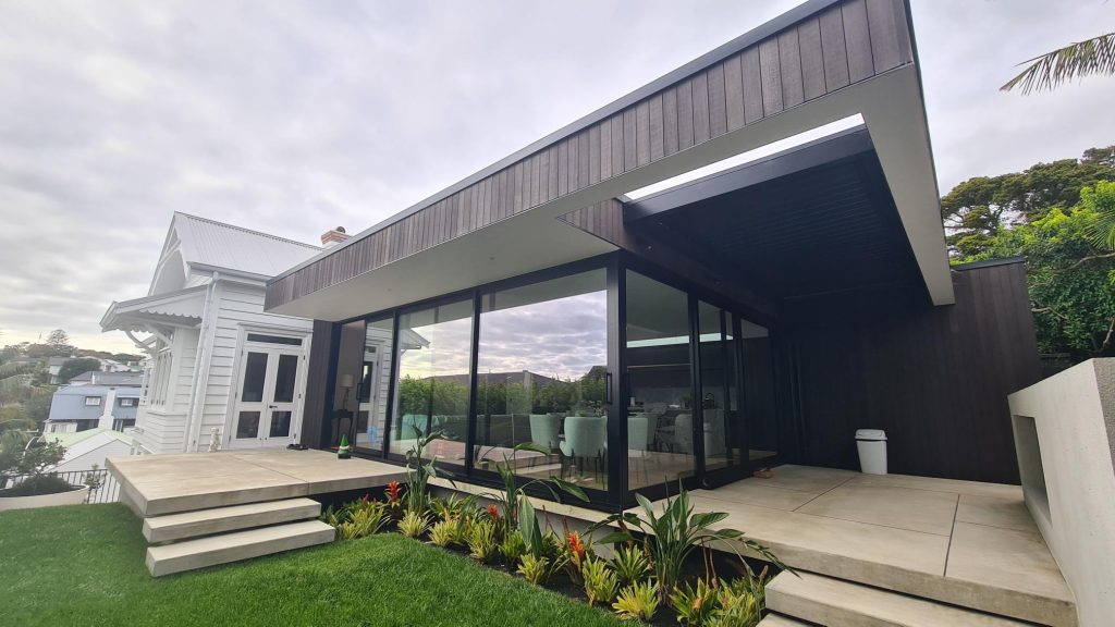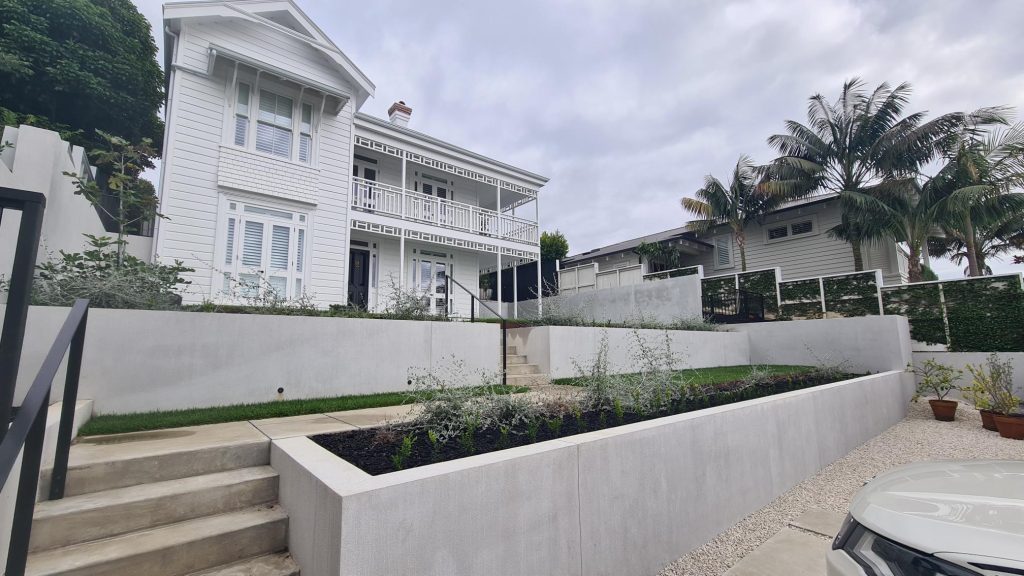 This St Marys Bay villa was lifted to create a new modern ground floor, wrap around balconies added to both levels, double garage and retaining walls